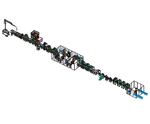 實(shí)現(xiàn)電芯上料,極耳裁切,整形,電壓內(nèi)阻測試,等離子清洗,電芯貼泡棉和電芯翻轉(zhuǎn)等功能模組焊接入殼組裝段實(shí)現(xiàn)極柱激光清洗,上巴片,激光焊接巴片,安裝采集線及測溫頭等功能。
